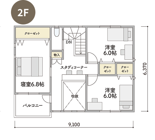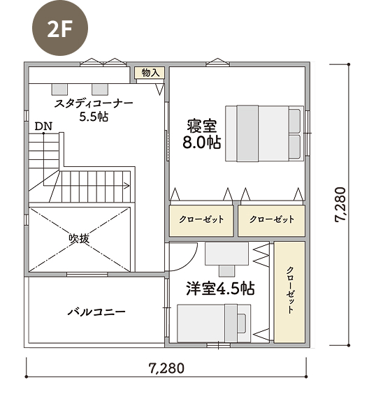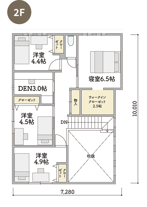 2Fには4つの洋室とプラスαのスペースとして書斎や趣味の部屋などフレキシブルに使えるDENのあるプランです。
