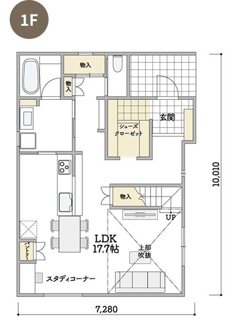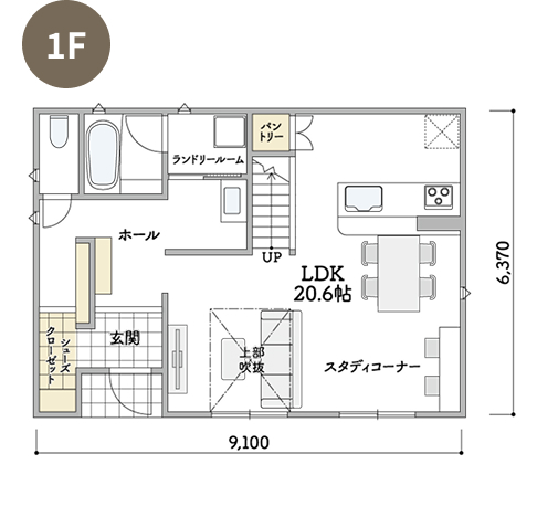 2Fの吹抜けに面したホールにスタディコーナーを設けた、Kurumuならではの間仕切りのないプランです。