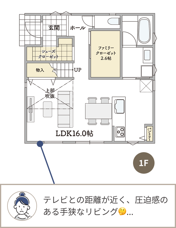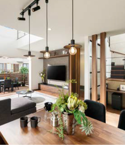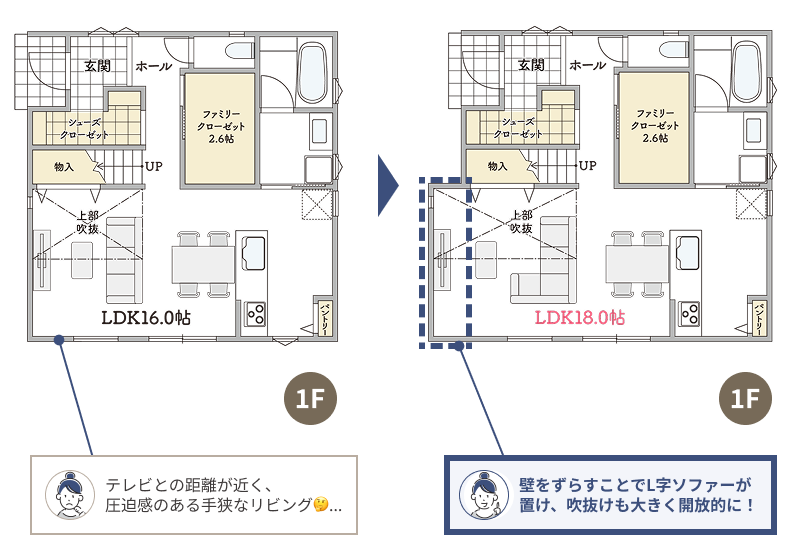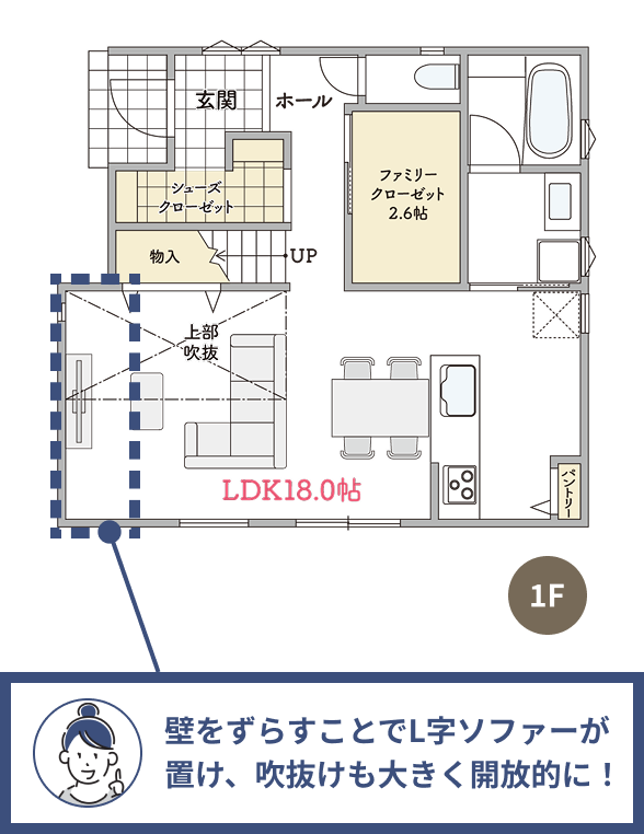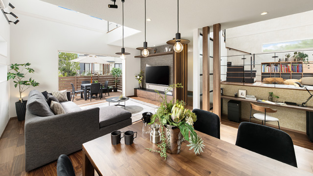 リビングの壁を調整すれば、手狭な空間が一変。L字ソファーや開放的な吹抜けで、毎日が心地よい大空間に生まれ変わります。