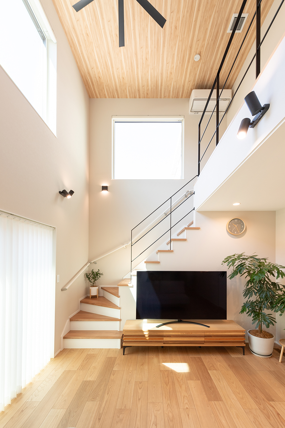 リビングから空を眺められるように吹抜けに大きな窓を2箇所設置しました。