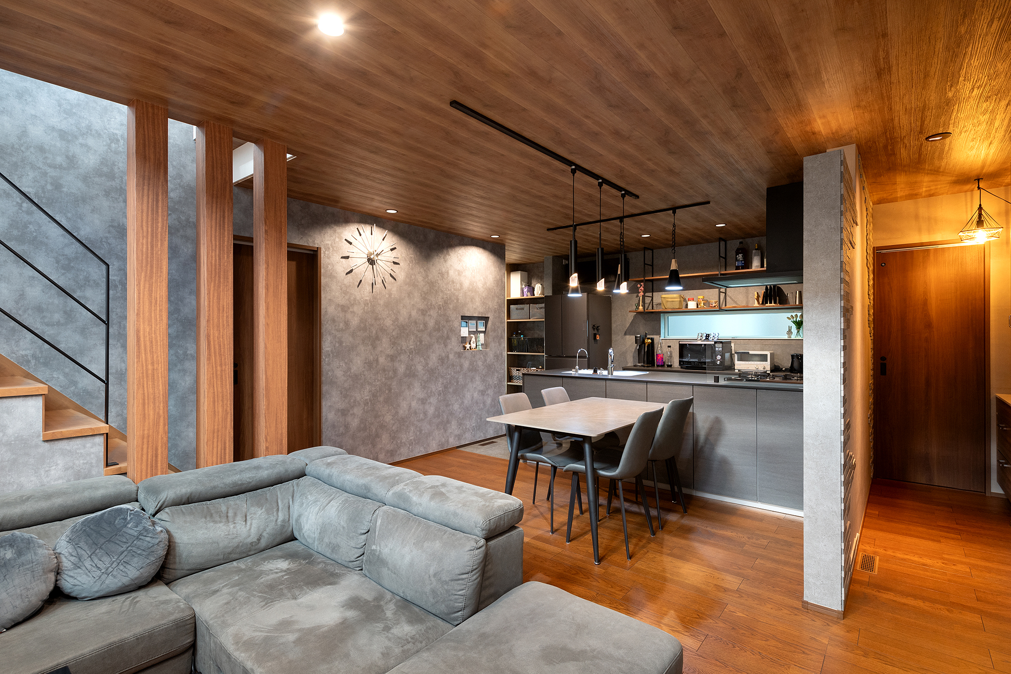吊り戸棚を設けず木目調の天井が一直線にリビング吹抜けへと繋がるオープンで広がりある空間づくり。