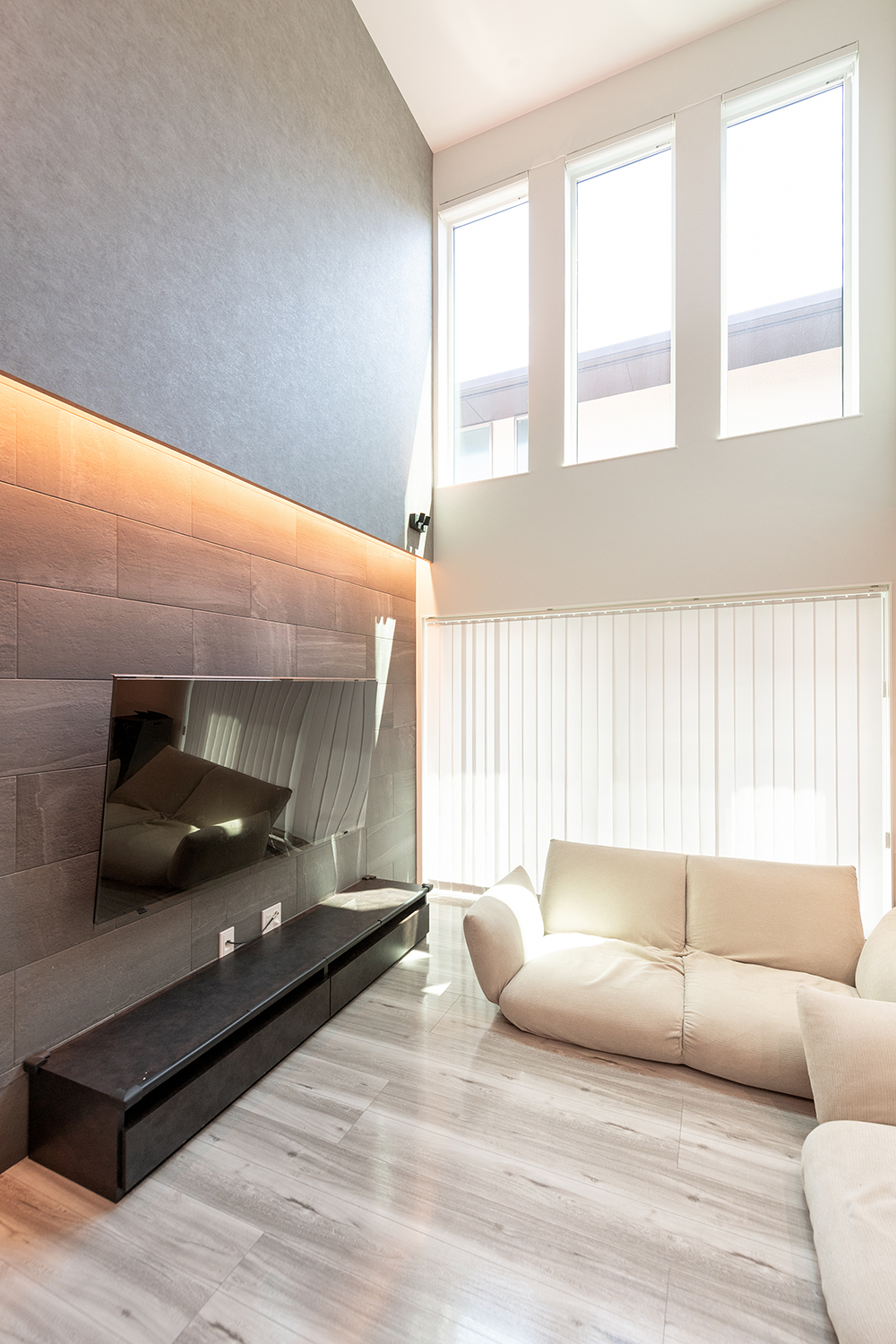 リビングが明るくなるように吹抜けを大きくとり開放的な空間に。大きな開口部でも音の侵入が少なく快適です。