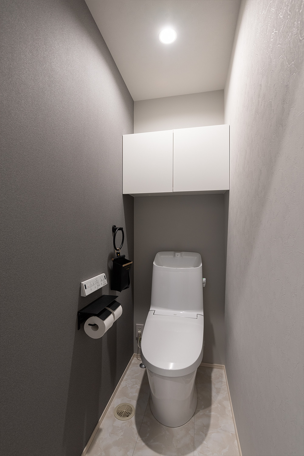 モノトーンでシンプルなクロスを左右異なるカラーで配し、落ち着いた空間に。