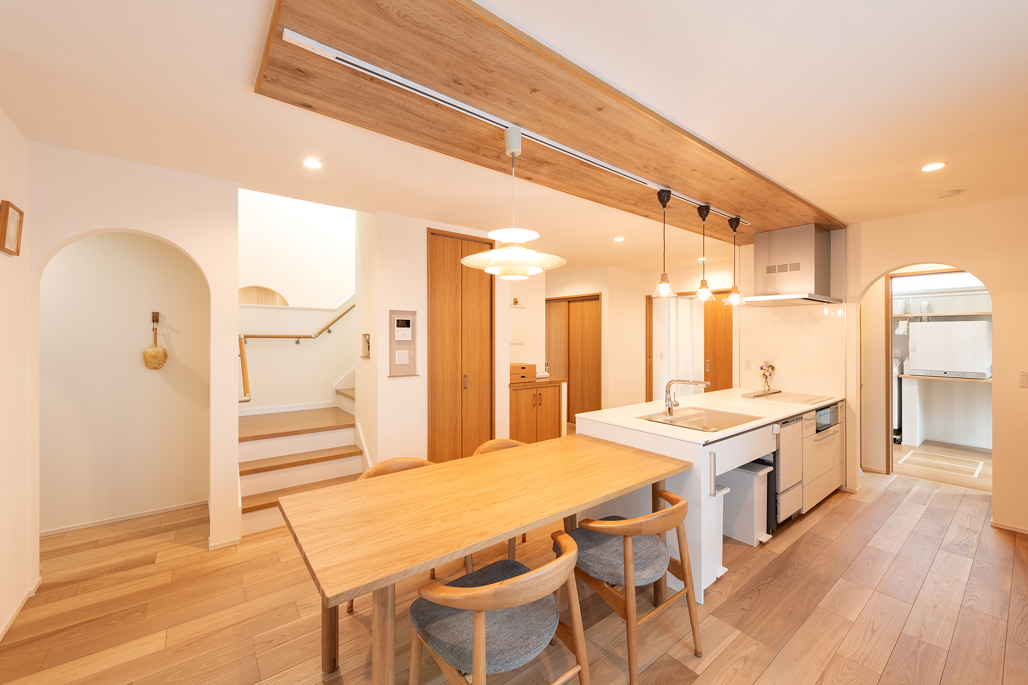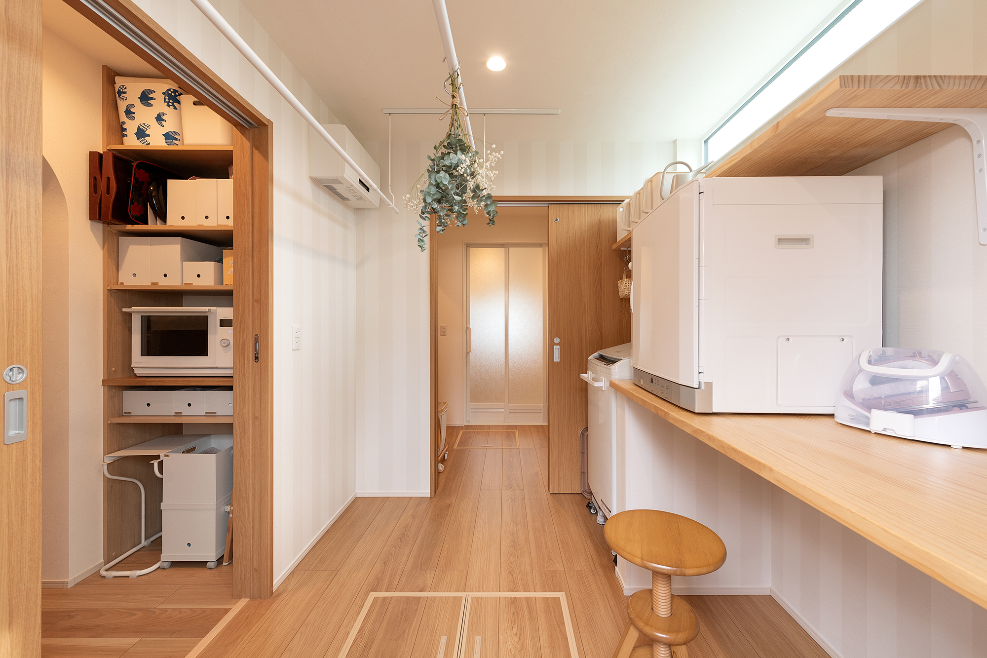 家事動線を第一に考えてキッチンからもアクセスできる2WAY設計のランドリールーム。