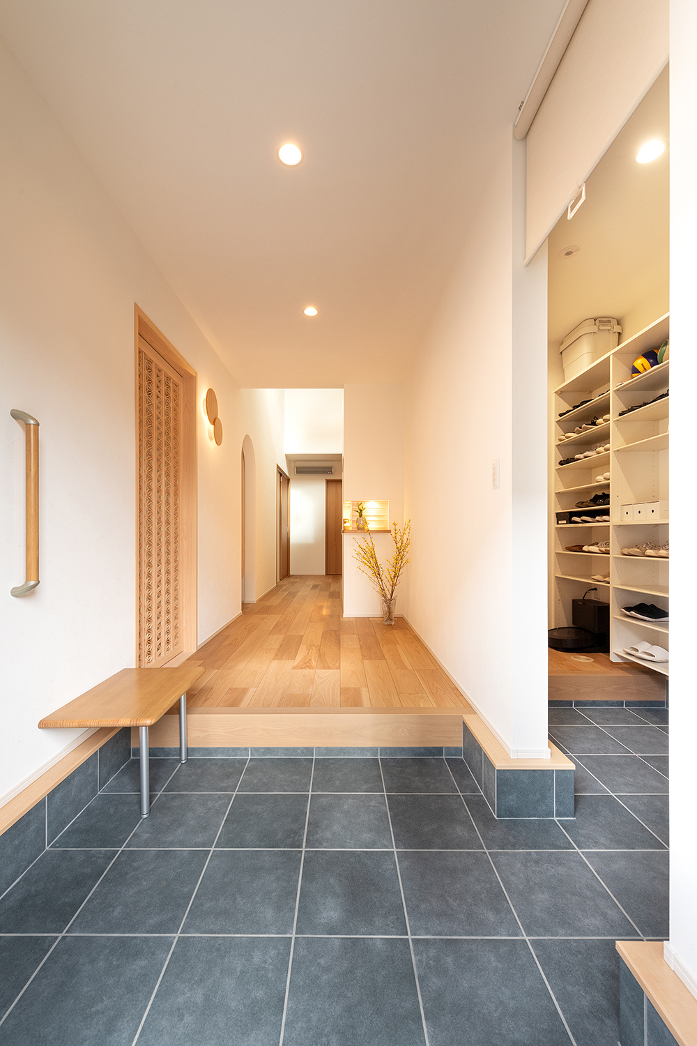 デザイン性とバリアフリーを両立した機能的なベンチ。シューズクロークを通ってダイニングキッチンに行けるのも便利です。