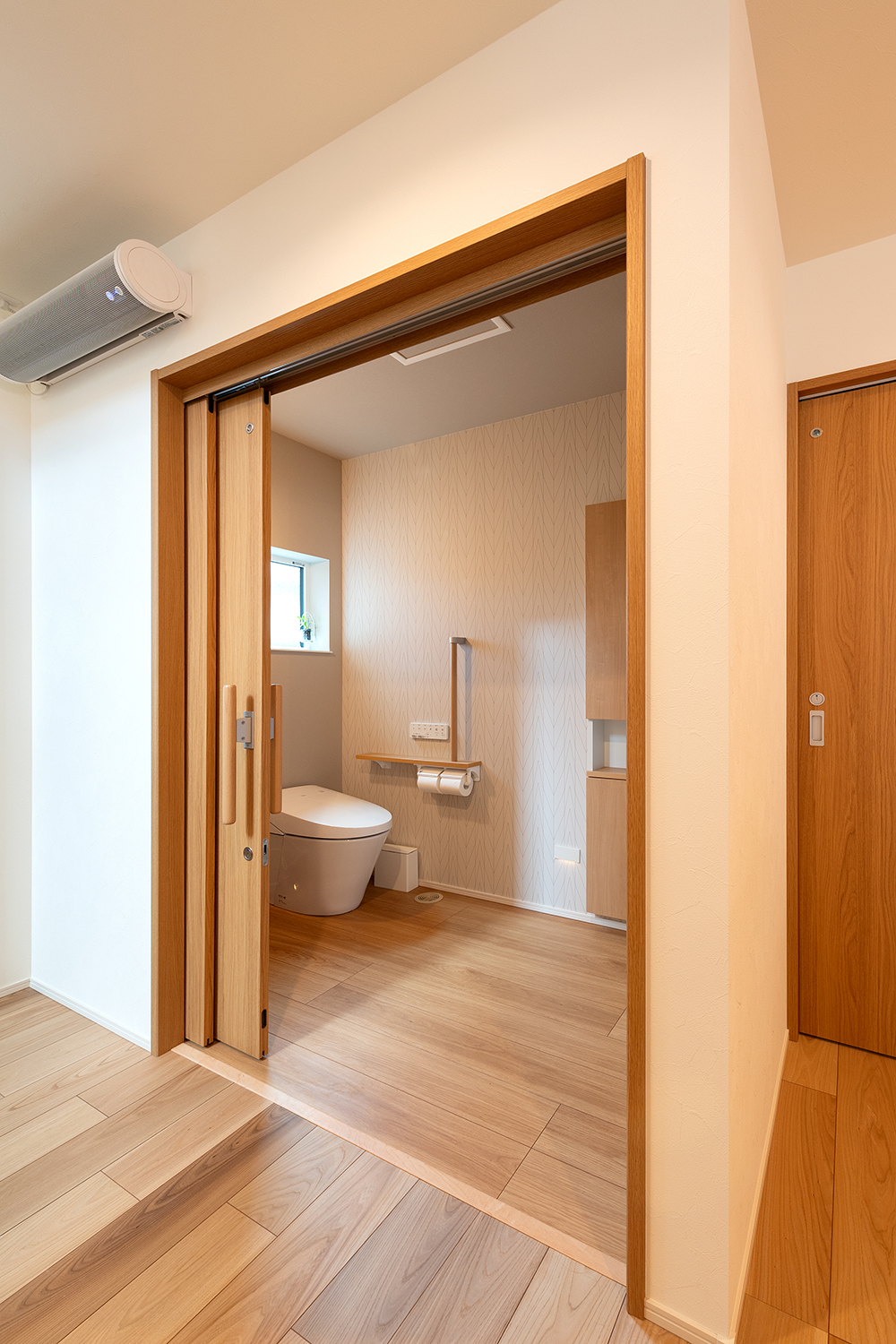 1階のトイレは車椅子でも利用しやすい引き戸でワイドな開口を採用しました。