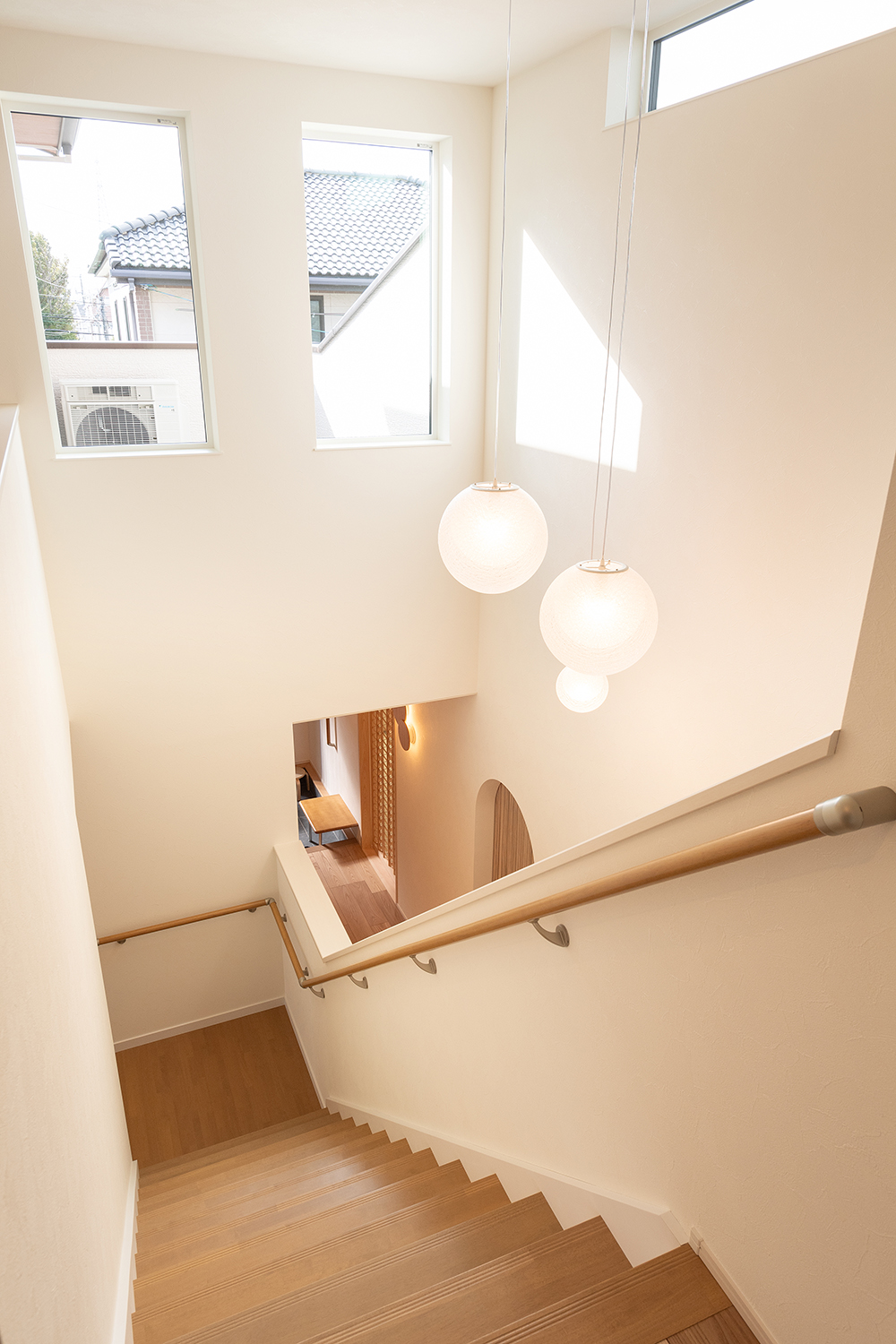 暗くなりがちな階段ホールは吹抜けや窓で明るく伸びやかな空間に。空気の通り道としても機能。