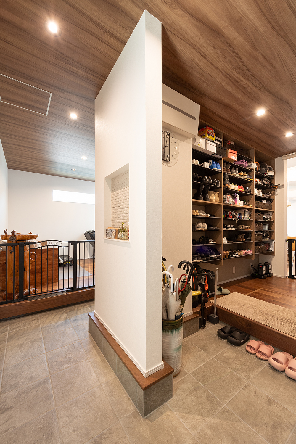 玄関はダブル動線でシューズクローゼットの中は飾り棚の壁で見えないように設計しました。