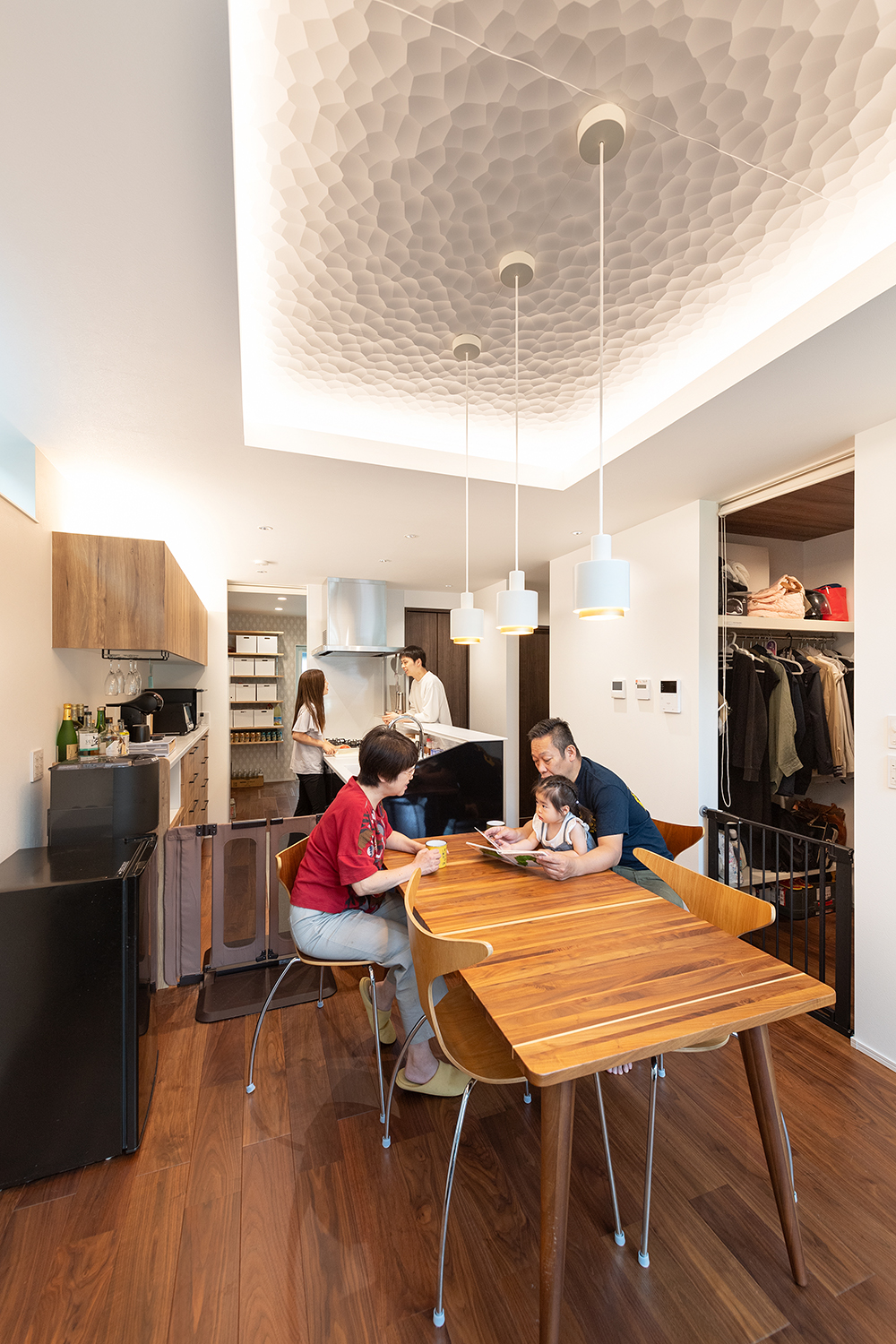 なぐり加工の折上天井は間接照明で高級感と広がりを感じさせます。