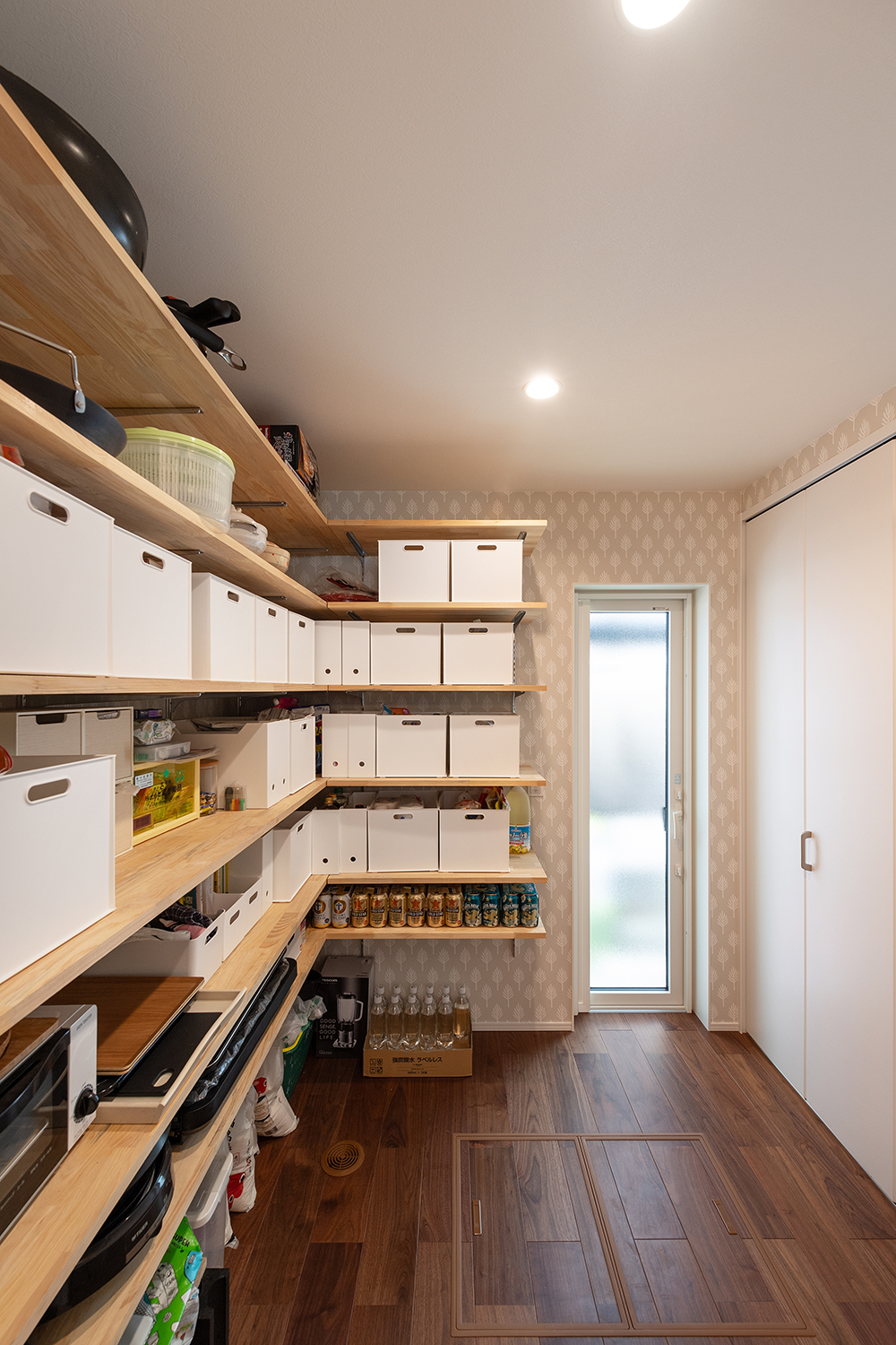 パントリーは広さにこだわり、使い勝手の良い棚はDIYが趣味の親世帯のご主人の手作り。