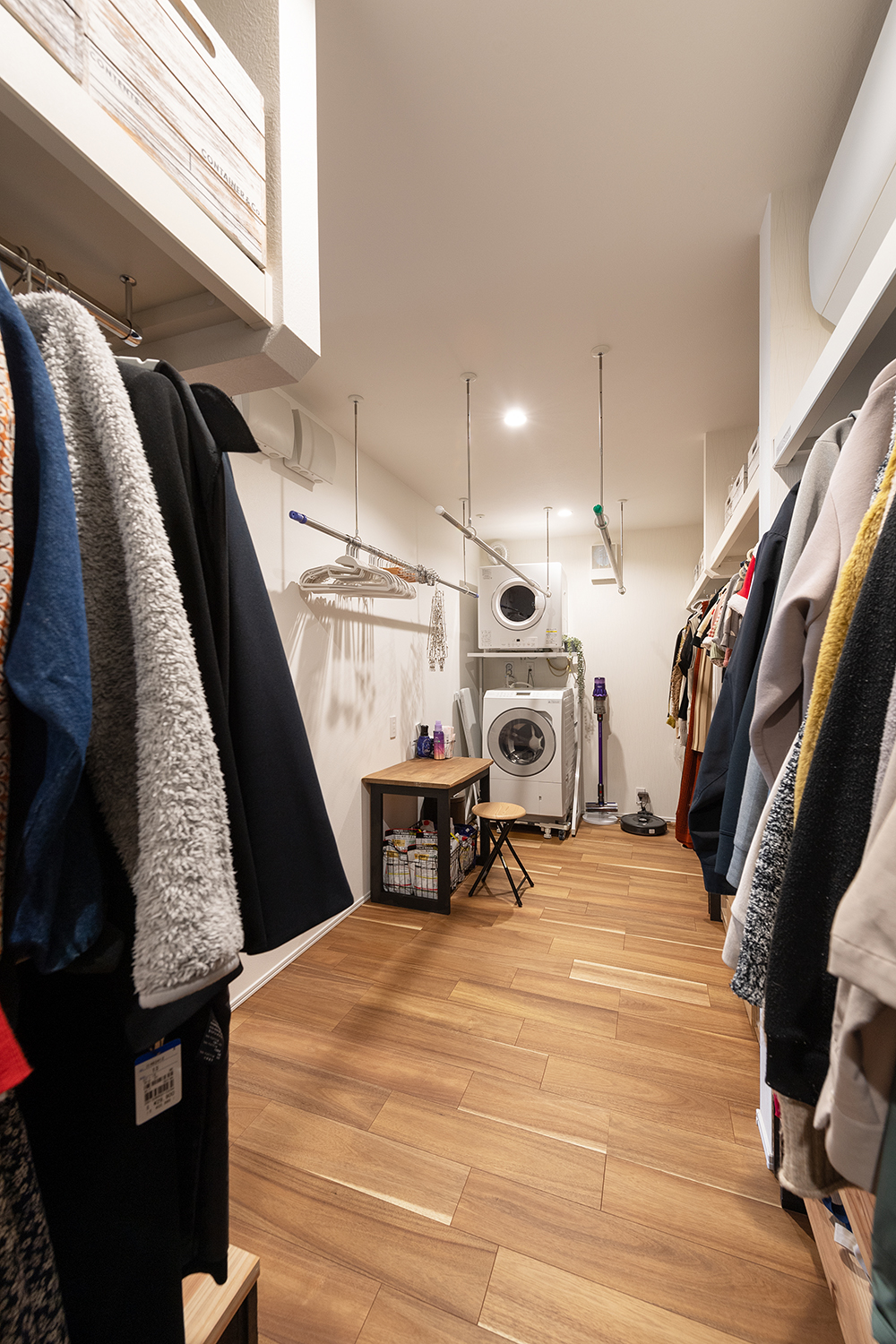 二世帯分の衣類を納められる大容量のファミリークローゼットはランドリールームを兼ねており、洗濯から収納までを完結できます。